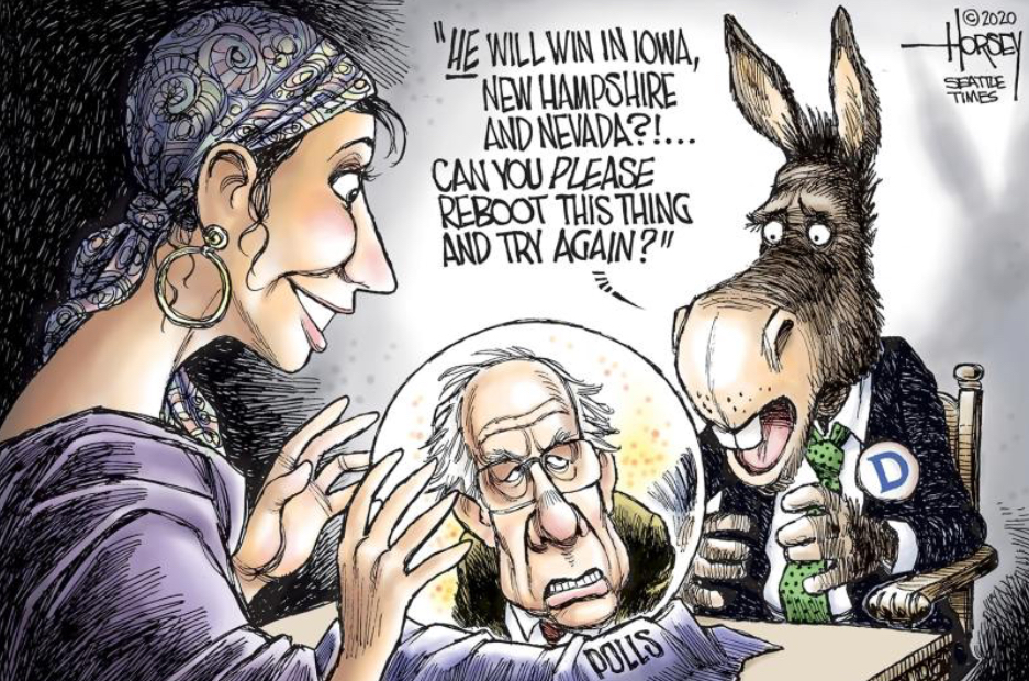 The donkey, or democrat, being upset is a nod to a group of democrats that think Bernie Sanders views are a bit too far left, and that the whole democratic party will move more left if he is voted for by the majority. This is why the donkey in the cartoon is worried about Sanders winning, and is asking for a reboot as if a new candidate would win in those polls instead. This idea however may be merely a conspiracy theory as to why the system used to collect the data for the Caucuses had technical difficulties that led the majority choice to be delayed. The theory is that the democrats caused the delay as a way to try to stop Sanders from winning the majority vote.